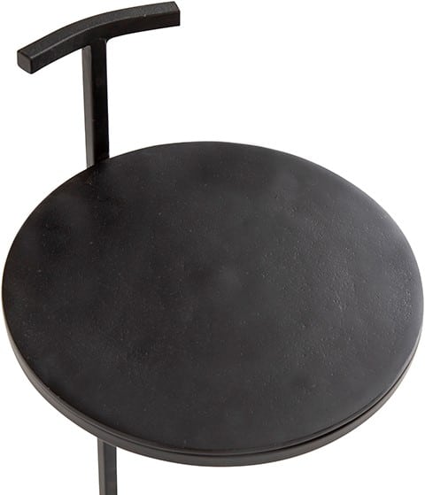 Met een tafelblad van aluminium en een stevig zwart gepoedercoat metalen frame biedt deze tafel zowel duurzaamheid als een verfijnde uitstraling. Dankzij het compacte formaat is de tafel ideaal als decoratief item of functioneel gebruik, zoals het plaatsen van een plant, lamp of accessoires.