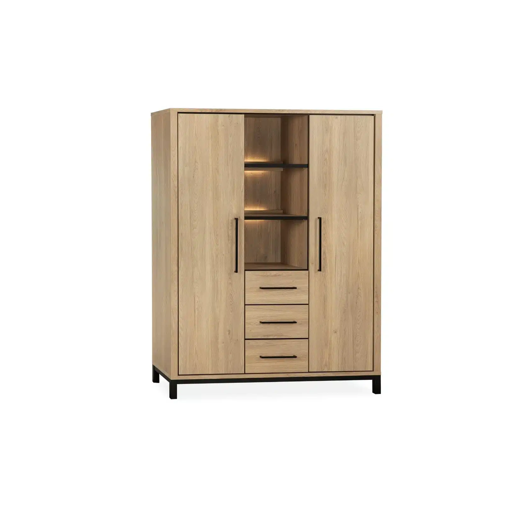 De kast is uitgerust met twee deuren, drie ruime lades en drie open vakken, waardoor hij een ideale mix biedt van opbergen en presenteren. De open compartimenten maken ruimte voor decoratieve items, terwijl de deuren en lades zorgen voor een opgeruimd geheel.