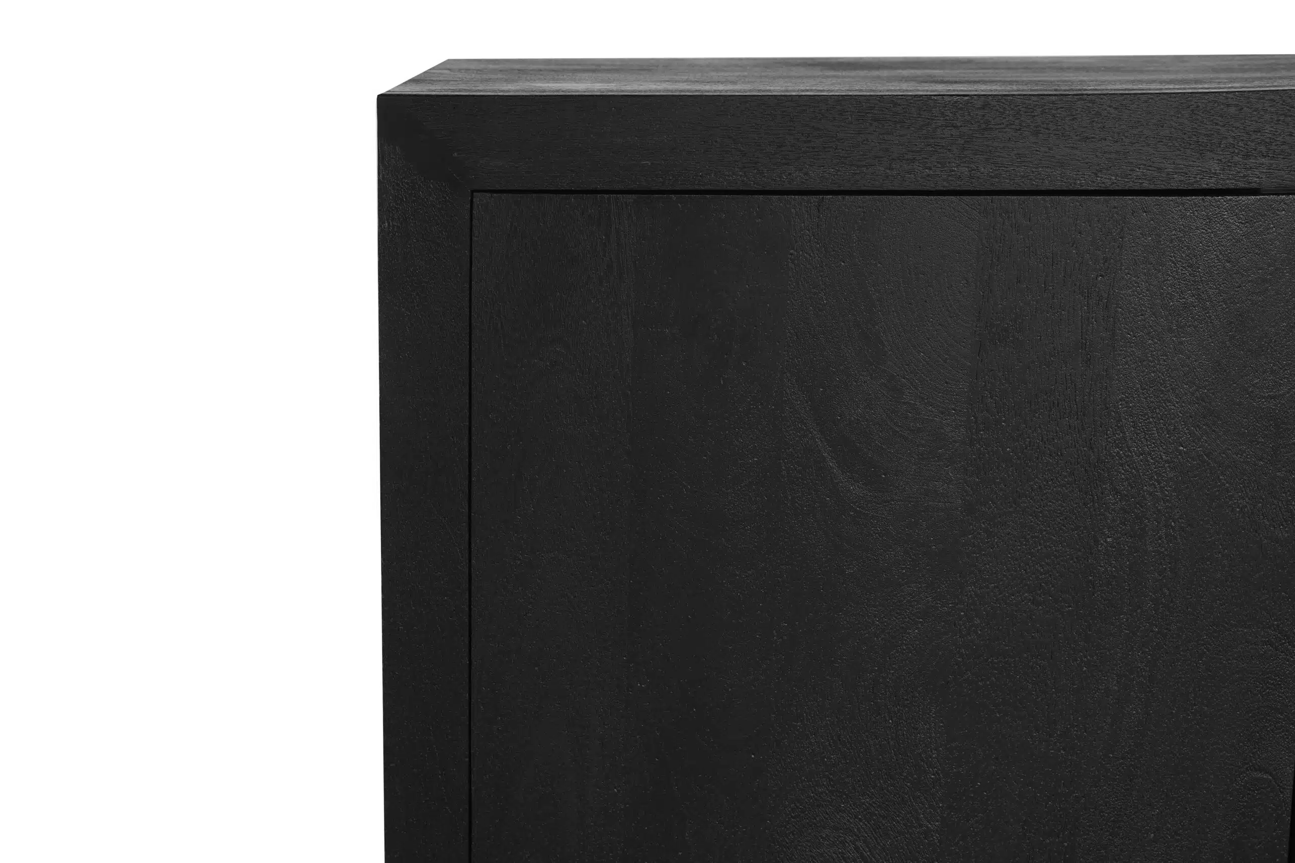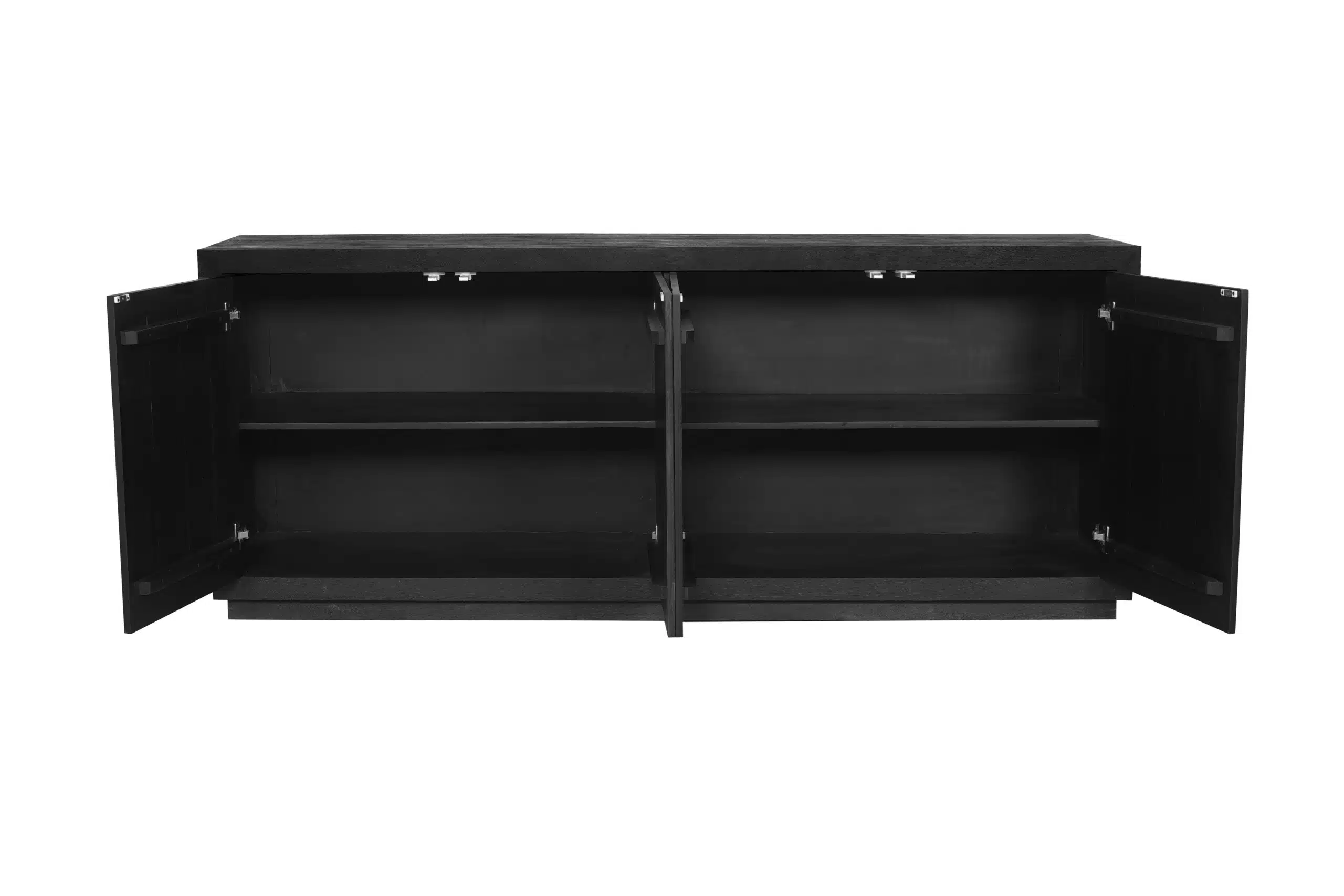 Dressoir Brussel Black, met een stijlvolle black finish, is een perfecte aanvulling voor elk interieur. Gemaakt van mangohout, biedt dit dressoir met zijn vier deuren, voorzien van een handig push-to-open systeem, een combinatie van een strak design en functionaliteit. Het biedt optimale opbergruimte en voegt een verfijnde uitstraling toe aan het interieur.
