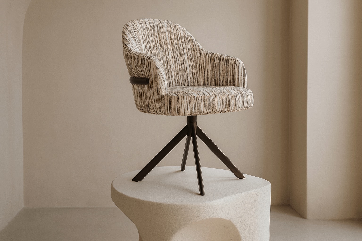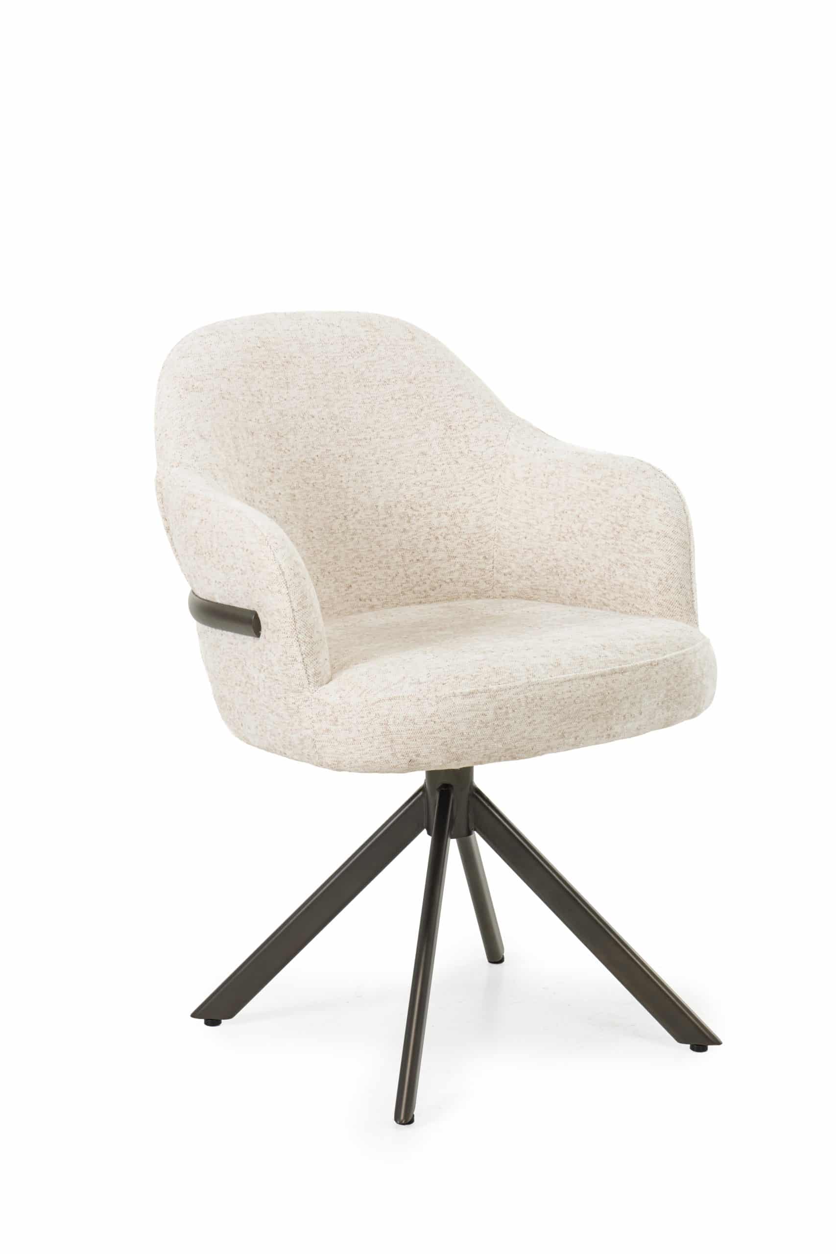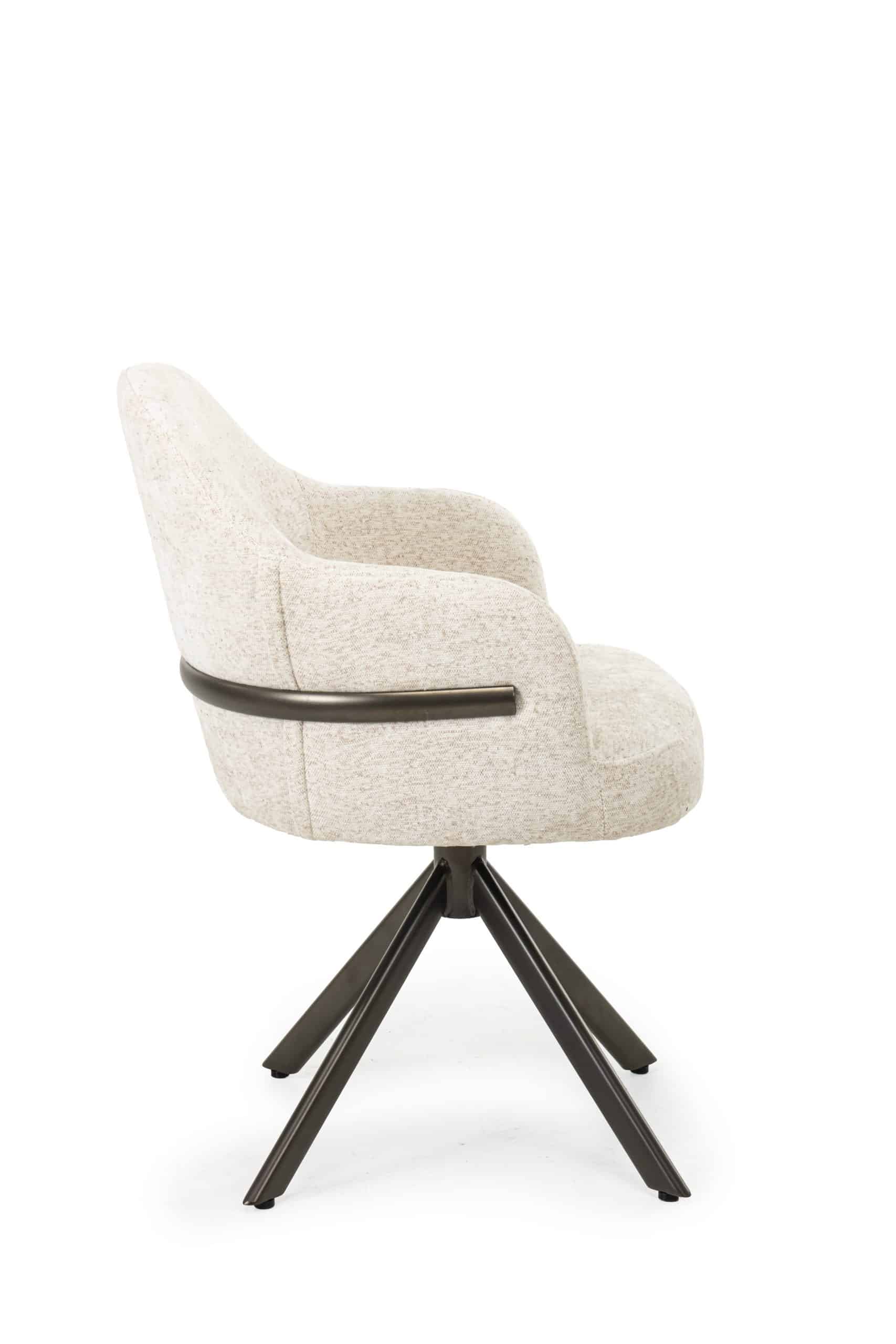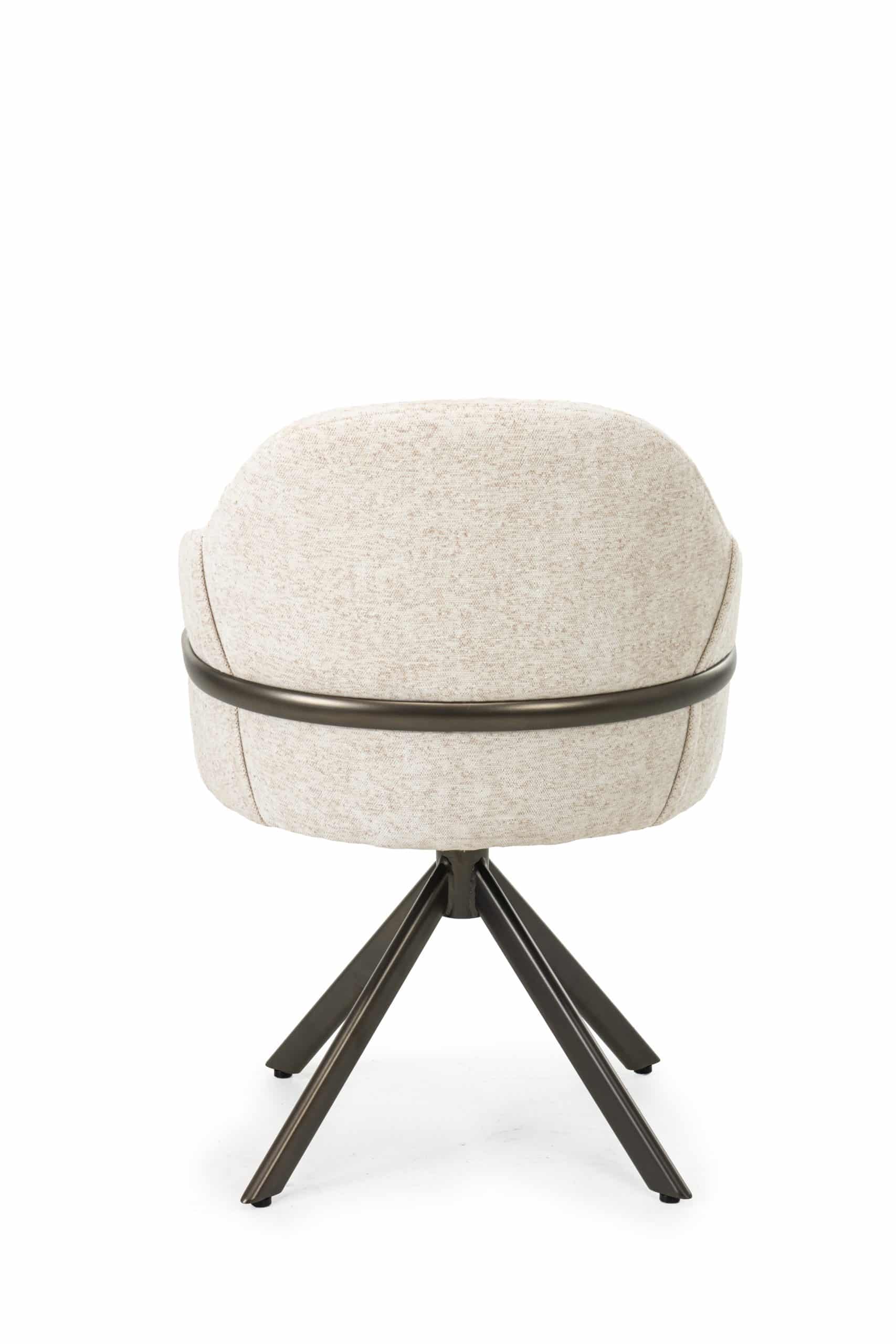 Een fraai en vernieuwend detail is de metalen band die elegant over de rugleuning loopt.