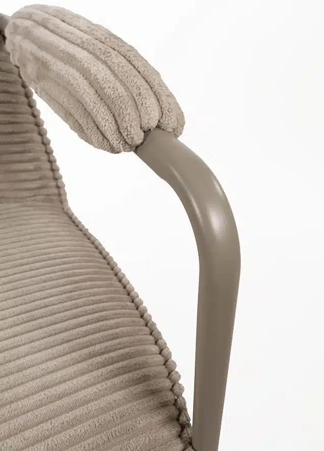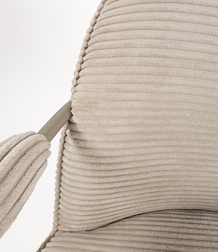 De zachte ribstof geeft de fauteuil een elegante en moderne uitstraling, met een subtiele speelsheid door de textuur. De stof is niet alleen stijlvol, maar ook praktisch, omdat het gemakkelijk te onderhouden is en een luxe uitstraling behoudt.