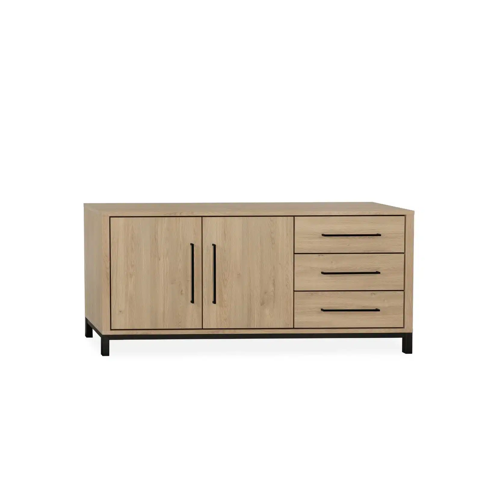 De natuurlijke houtstructuur in combinatie met de zwarte metalen handgrepen en het robuuste onderstel geven het dressoir een stoere, eigentijdse uitstraling. Met twee ruime deuren en drie handige lades biedt dit meubel volop opbergruimte voor servies, woonaccessoires, tafeltextiel of andere dagelijkse spullen.