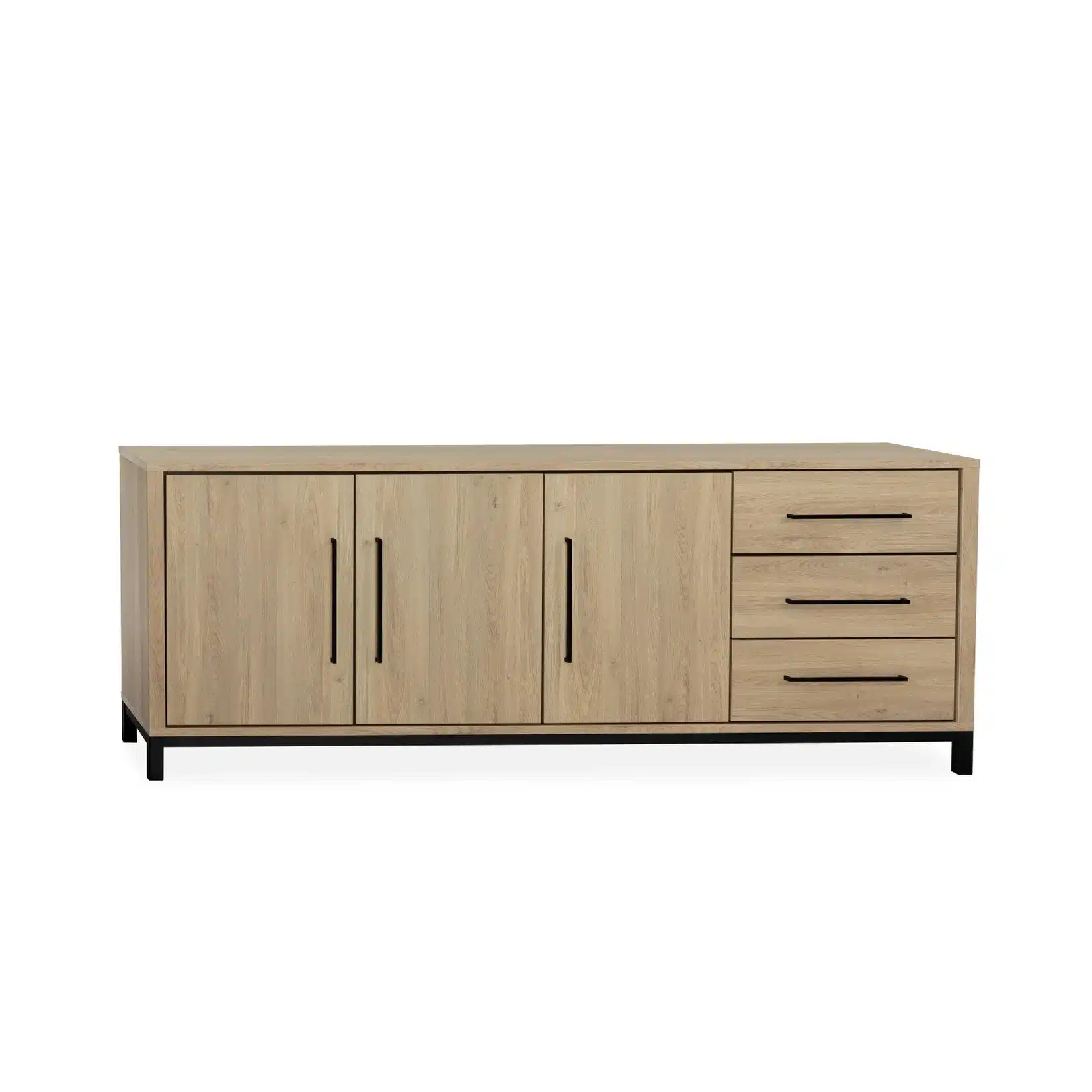 De combinatie van de natuurlijke houtlook met zwarte metalen handgrepen en een stevig metalen onderstel geeft het dressoir een stoere en eigentijdse uitstraling. Met drie deuren en drie ruime lades beschikt dit dressoir over bijzonder veel opbergruimte voor servies, linnengoed, woonaccessoires of andere spullen die je graag netjes uit het zicht houdt.