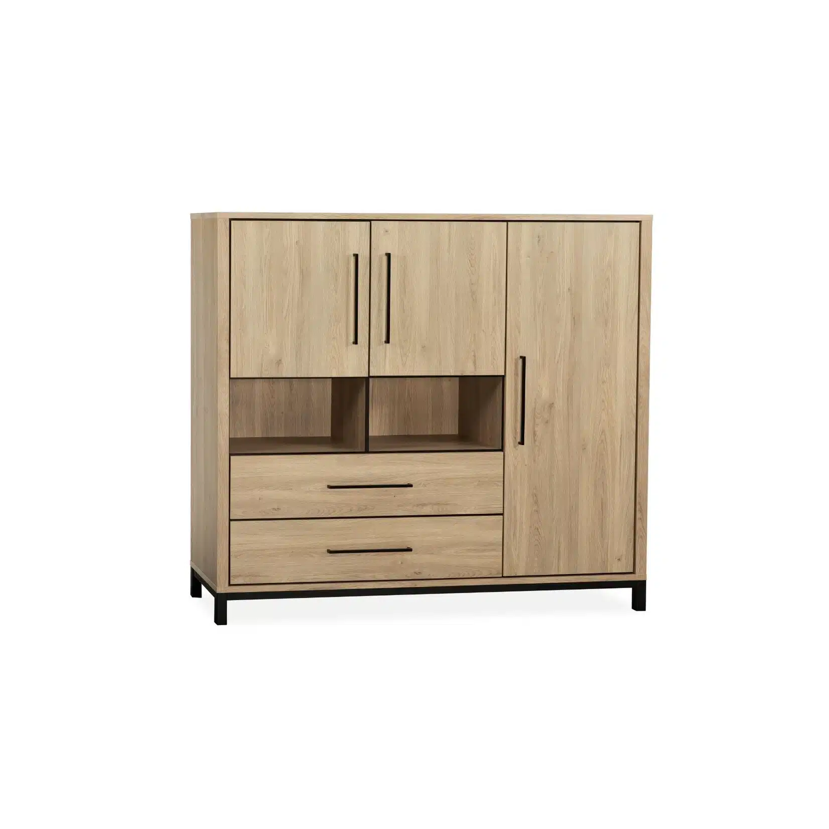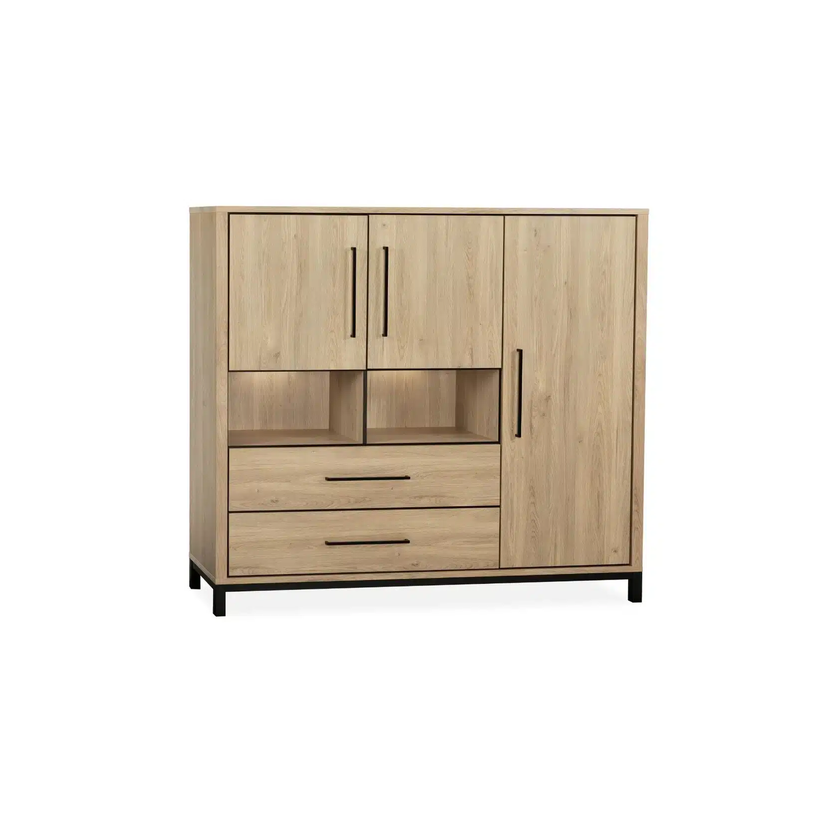 De natuurlijke houtlook wordt prachtig geaccentueerd door de zwarte metalen handgrepen en het metalen onderstel, wat de kast een stoer en eigentijds karakter geeft. De indeling is zowel functioneel als sfeervol: drie deuren, twee ruime lades en twee open vakken zorgen voor een perfecte balans tussen opbergen en presenteren. Boeken, servies of woonaccessoires krijgen hun eigen plek, terwijl je andere spullen netjes uit het zicht houdt.