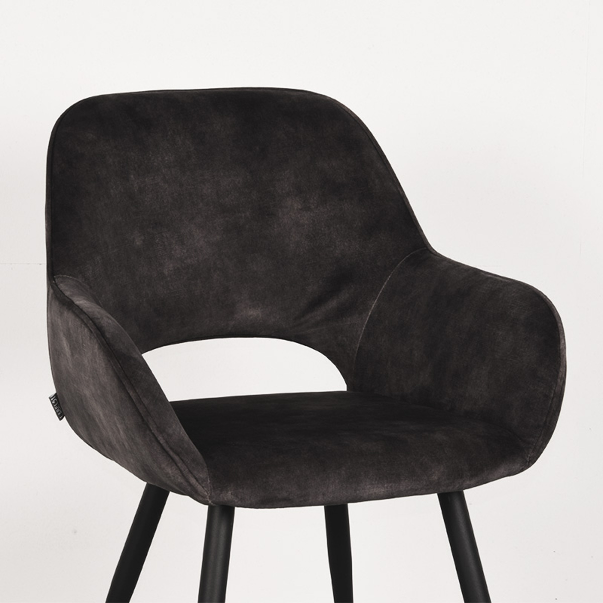 Eetkamerstoel Fer van LABEL51 is een prachtige armstoel uitgevoerd in antraciet velours waar comfort en verfijning samen komen. De mooie zitting met een speelse uitsparing in de rugleuning in combinatie met de fraaie zwarte poten maken Fer tot een topper in zijn segment.