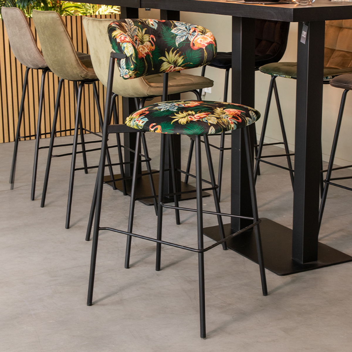 Barkruk Ferry van LABEL51 heeft niet veel woorden nodig. Dit opvallende stoeltje zegt door zijn hippe uiterlijk meer dan duizend woorden. Het knallende flamingoprintje, de gebogen rugleuning en de strakke poot, als je wil opvallen ben je bij Ferry aan het juiste adres!