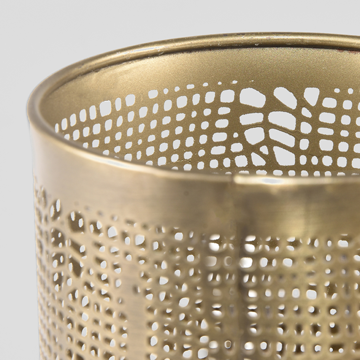 Set Kaarsenhouders M van LABEL51 bestaat uit twee formaten van antiek goud metaal. De Kaarsenhouders M zijn opengewerkt. Het patroon is geïnspireerd op de structuur van grof geweven jute. Deze opengewerkte structuur geeft een prachtige, romantische lichtspreiding. Maar ook zonder waxinelichtje is de set een lust voor het oog.