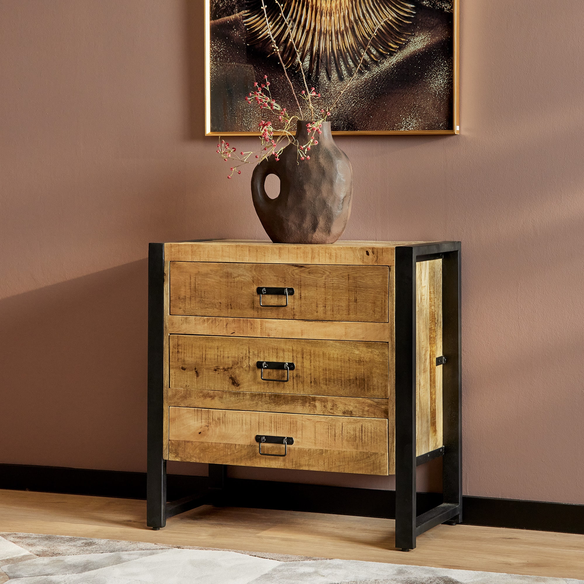 Ladenkast Boaz wordt uitgevoerd in het mangohout. Het metalen frame en de metalen handgreep zijn afgewerkt met een zwarte lak. Dit model is voorzien van drie lades. De ladenkast is ingelegd met verschillende stroken gelakt hout, waar het meubel zijn eigentijdse karakter aan te danken heeft.