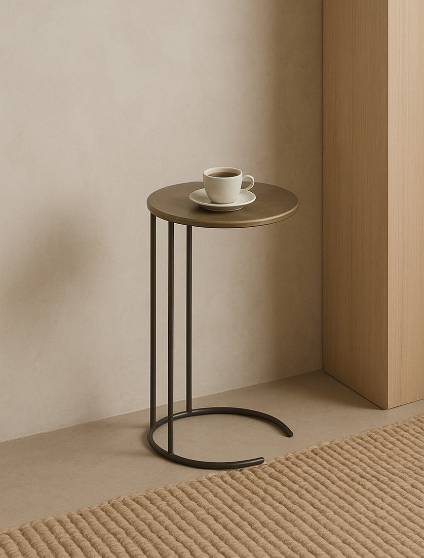 De Monocle laptoptafelis een verfijnde en praktische toevoeging aan je interieur. Het goudkleurige Brass Antique tafelblad zorgt voor een luxe uitstraling, terwijl het zwarte gepoedercoate metalen frame stabiliteit biedt. Het ronde tafelblad en het slanke ontwerp maken de tafel perfect voor kleinere ruimtes, zoals een zithoek of een werkkamer.