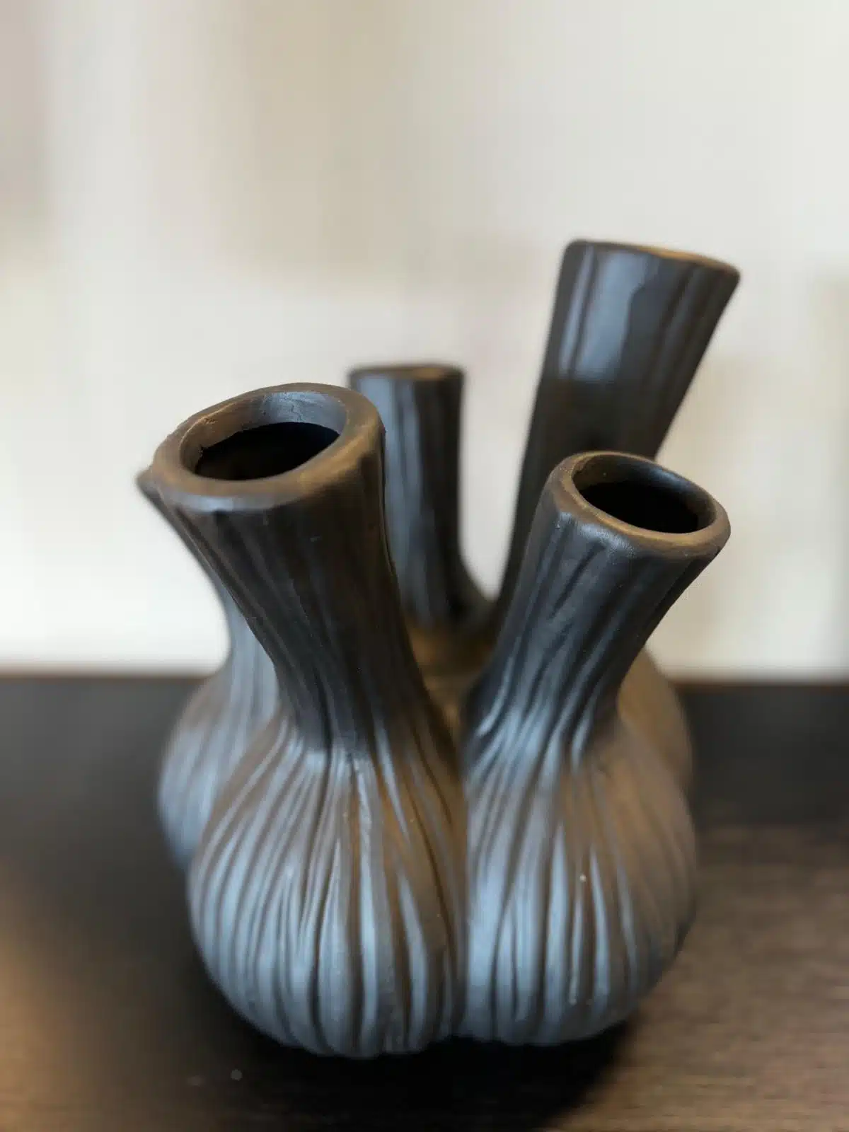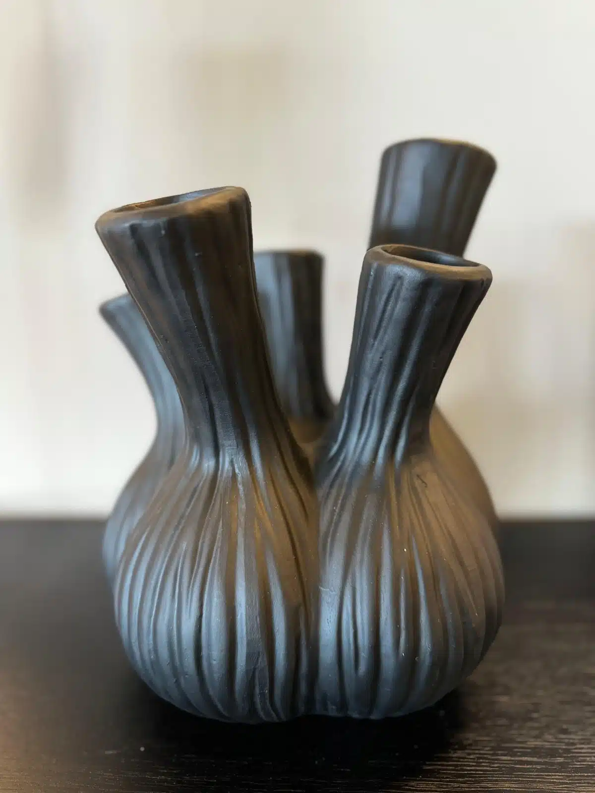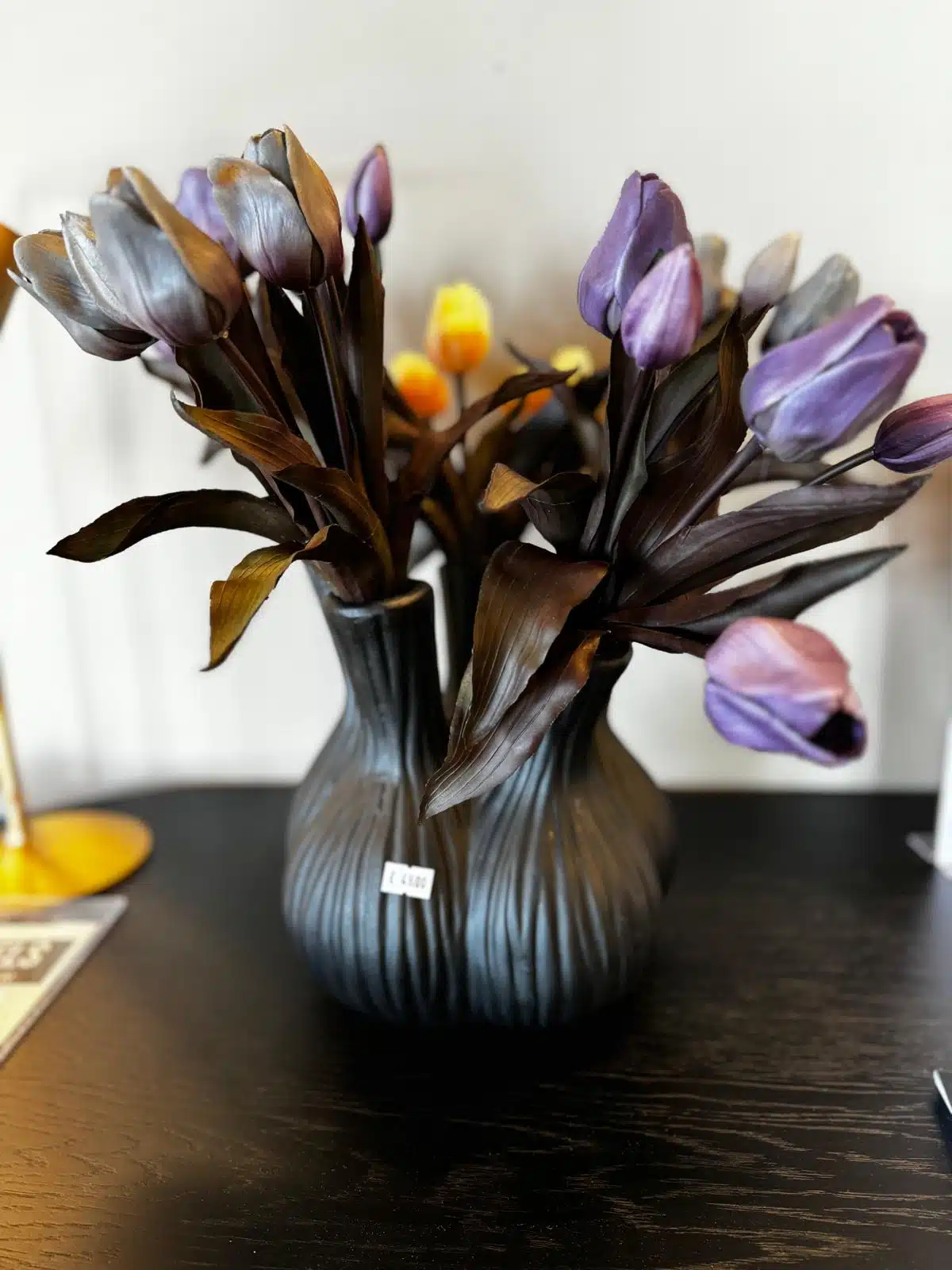 Mooie keramieken tulpenvaas in de kleur mat-zwart met 5 bossen kunst tulpen. Hoogte vaas 23 cm
