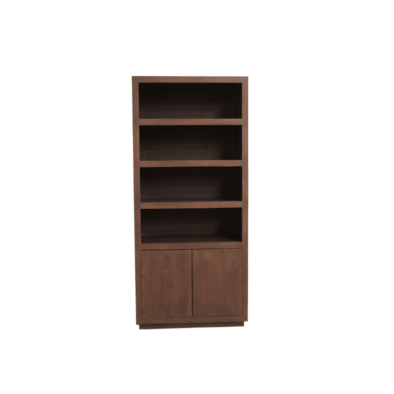 Ontdek Boekenkast Brussel Walnut, gemaakt van mangohout en afgewerkt met een stijlvolle walnoot finish. Deze kast combineert een stijlvol en strak design met functionaliteit. Met vier open vakken, inclusief legplanken, en twee greeploze deuren uitgerust met een handig push-to-open systeem, biedt deze kast een perfecte balans tussen opbergruimte en presentatie.
