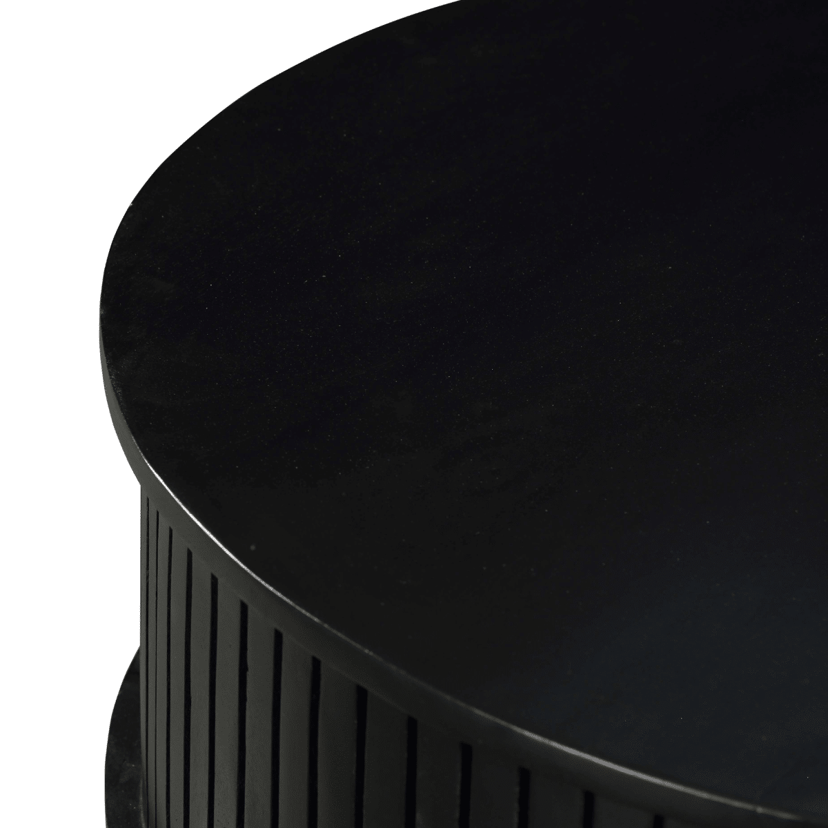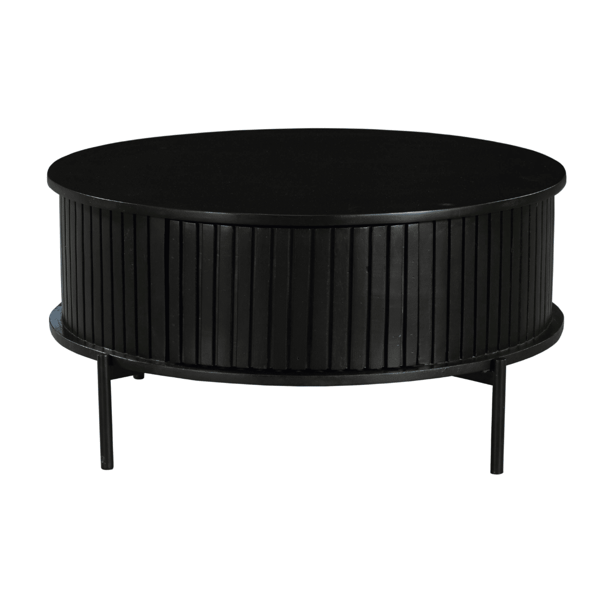Salontafel Madison Rond is gemaakt van mangohout. De metalen poten zijn afgewerkt met een zwarte lak. Dit model is voorzien van twee lades. De lades en zijkanten zijn voorzien van een verticaal lattenpatroon en is afgewerkt met een zwarte lak.
