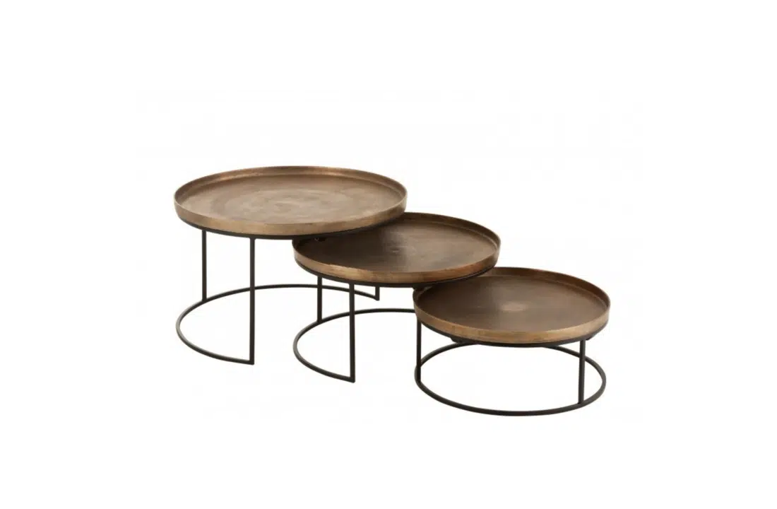 Salontafel set Clive is een set van drie ronde salontafels. De ronde tafelbladen zijn gemaakt van aluminium die zijn afgewerkt met een koper tint finish. De combinatie van het metaal met de aluminium tafelbladen zorgt voor een chique, luxueuze look.
