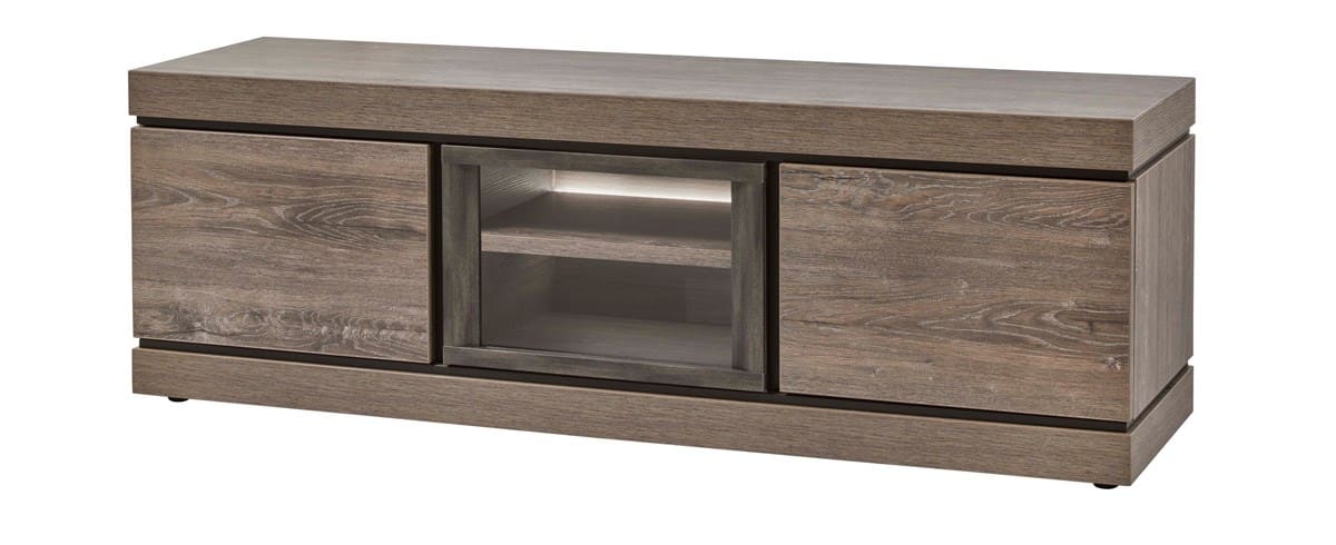 Deze tv-kast maakt deel uit van de collectie ‘Marlou’. Marlou is een complete eetkamerset verkrijgbaar in 2 kleuren. Deze eetkamer meubelen hebben dankzij hun strak design, geïntegreerde ledverlichting en eikenpatroon een moderne toets. Deze tv-kast heeft 2 houten deuren, met achter elke deur een legplank, en 1 glasdeur met ledverlichting. Deze tv-kast is ook beschikbaar in een kleinere uitvoering. B176,6 x D50 x H59 cm