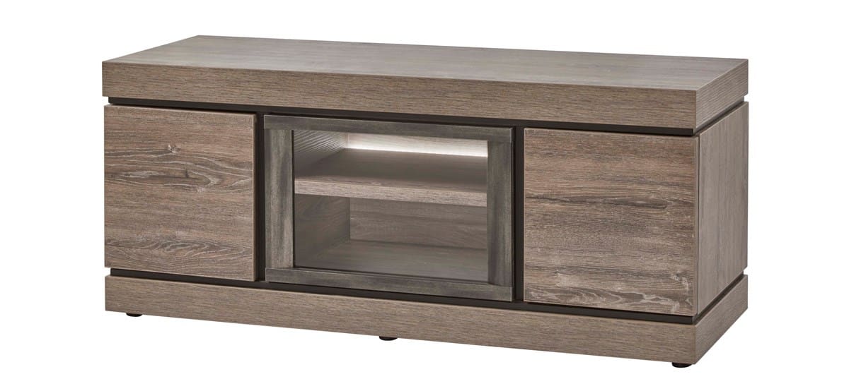 Deze tv-kast maakt deel uit van de collectie ‘Marlou’. Marlou is een complete eetkamerset verkrijgbaar in 2 kleuren. Deze eetkamer meubelen hebben dankzij hun strak design, geïntegreerde ledverlichting en eikenpatroon een moderne toets. Deze tv-kast heeft 2 houten deuren, met achter elke deur een legplank, en 1 glasdeur met ledverlichting. Deze tv-kast is ook beschikbaar in een grotere uitvoering. B136 x D50 x H59 cm