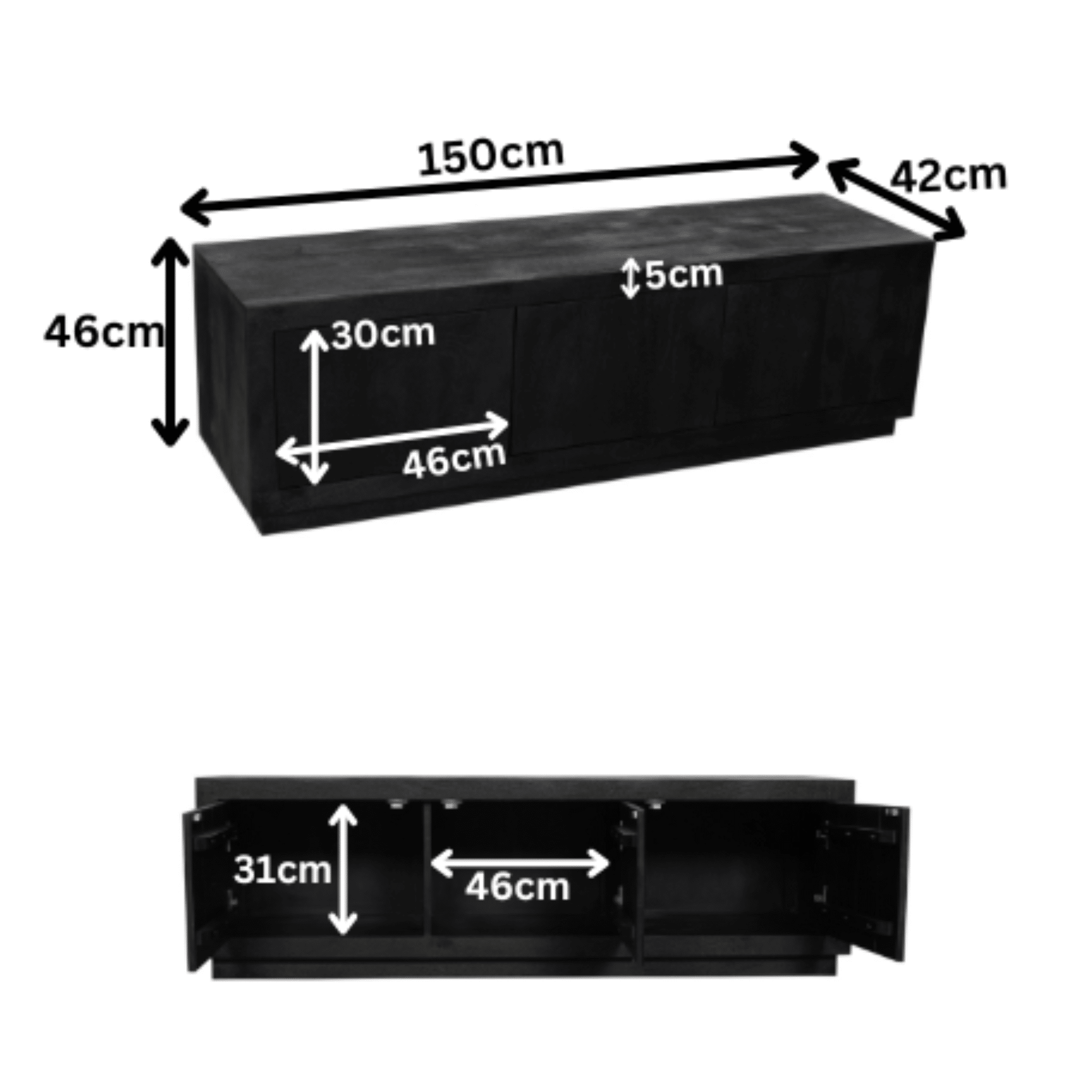 TV-meubel Brussel Black is gemaakt mangohout en afgewerkt met een verfijnde black finish. Dit meubelstuk straalt stijl uit dankzij het strakke en eigentijdse design. Met vier greeploze deuren, voorzien van een handig push-to-open systeem, biedt dit meubel niet alleen een moderne uitstraling maar ook functionele opbergruimte voor al je media-apparatuur.