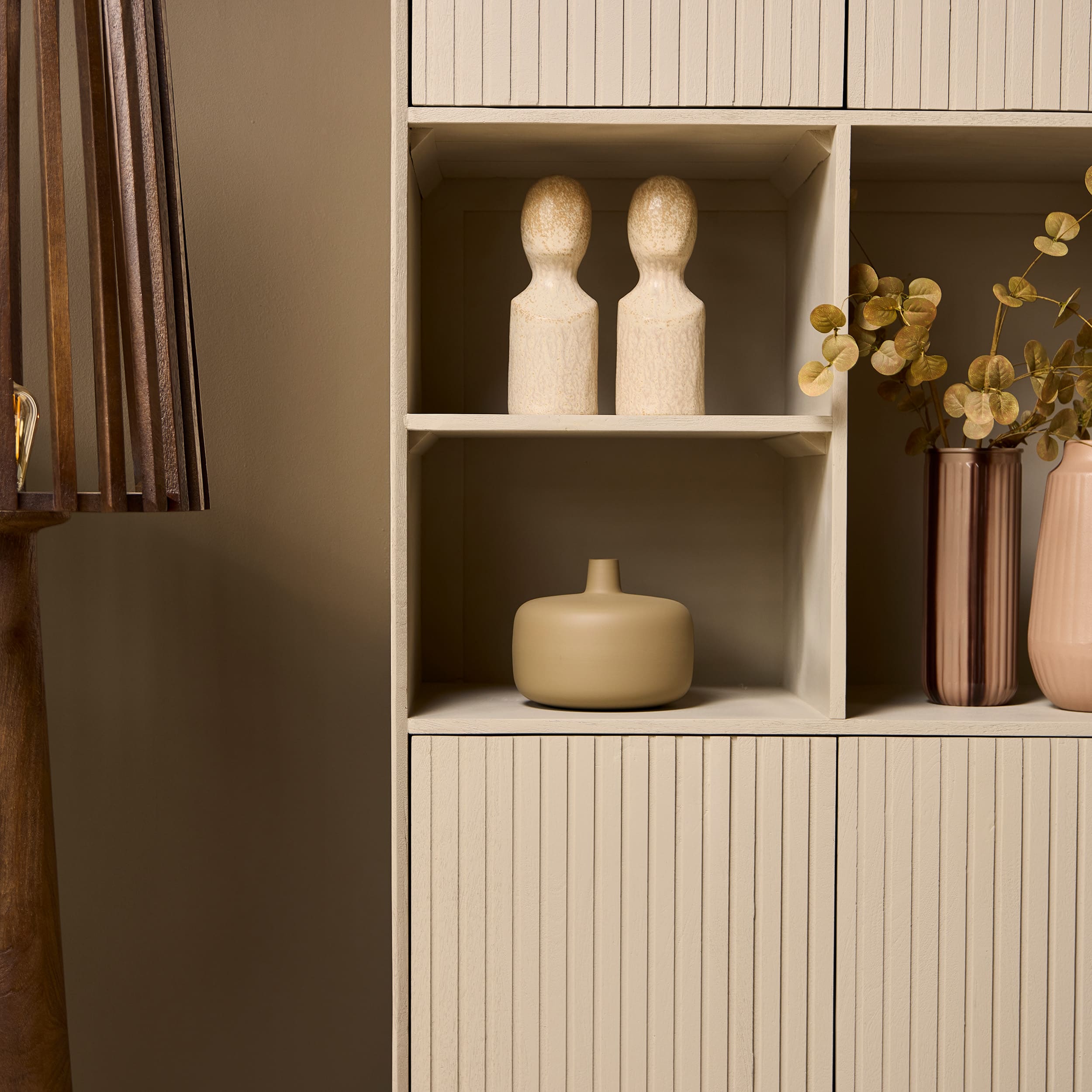 De vakkenkast Madison Sand is gemaakt van licht gezandstraald mangohout en afgewerkt met een verfijnde sand finish. Het metalen frame met een stijlvolle bronzen finish biedt een modern accent. Dit model beschikt over drie open vakken en vier deuren, elk voorzien van een verticaal lattenpatroon.