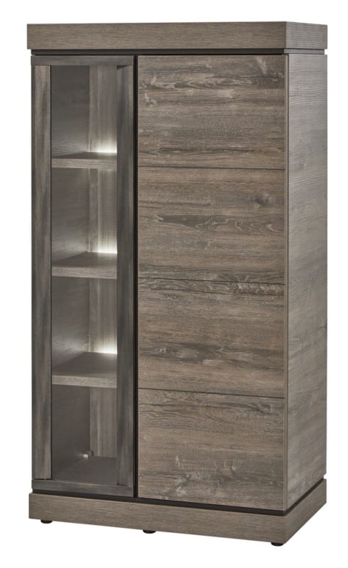 Deze vitrine maakt deel uit van de collectie ‘Marlou’. De collectie ‘Marlou’  is een complete eetkamer verkrijgbaar in 2 kleuren. Deze eetkamer heeft dankzij zijn strak design, geïntegreerde ledverlichting en eikenpatroon een moderne toets. Deze vitrine heeft 1 houten deur en 1 glazen deur met achter elke deur 3 legplanken. Achter de glazen deur zit ledverlichting. Zo kun je mooie foto’s of andere decoratie in de kijker zetten zonder dat hier stof aan kan! B84,4 x D50 x H158,4 cm