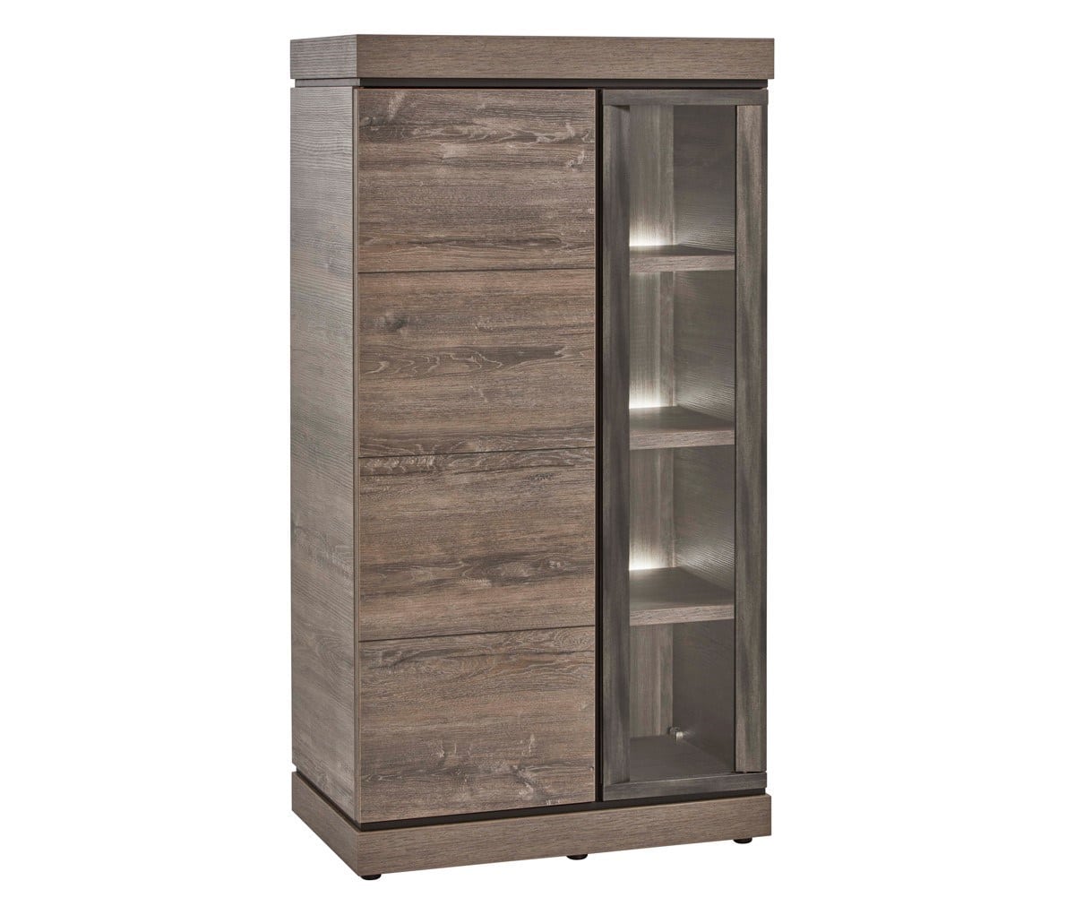 Deze vitrine maakt deel uit van de collectie ‘Marlou’. De collectie ‘Marlou’ is een complete eetkamer verkrijgbaar in 2 kleuren. Deze eetkamer heeft dankzij zijn strak design, geïntegreerde ledverlichting en eikenpatroon een moderne toets. Deze vitrine heeft 1 houten deur en 1 glazen deur met achter elke deur 3 legplanken. Achter de glazen deur zit ledverlichting. Zo kun je mooie foto’s of andere decoratie in de kijker zetten zonder dat hier stof aan kan! B84,4 x D50 x H158,4 cm