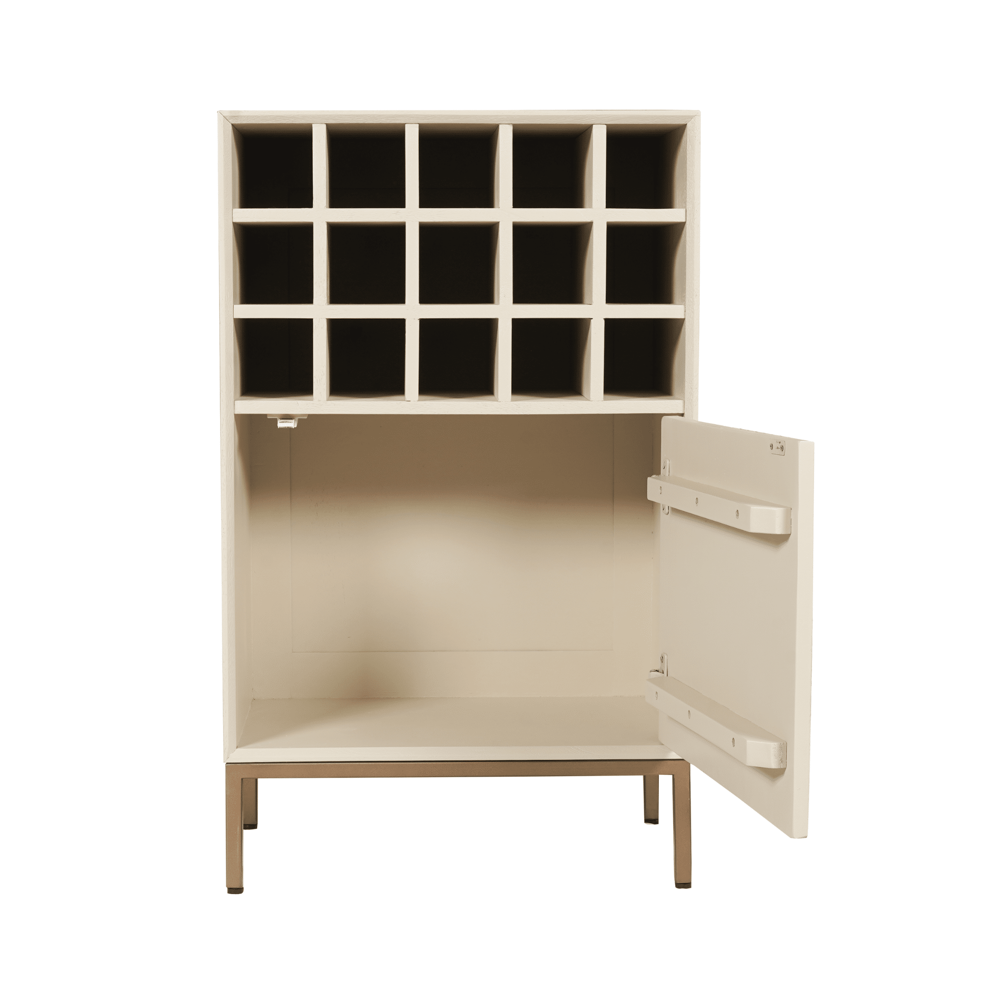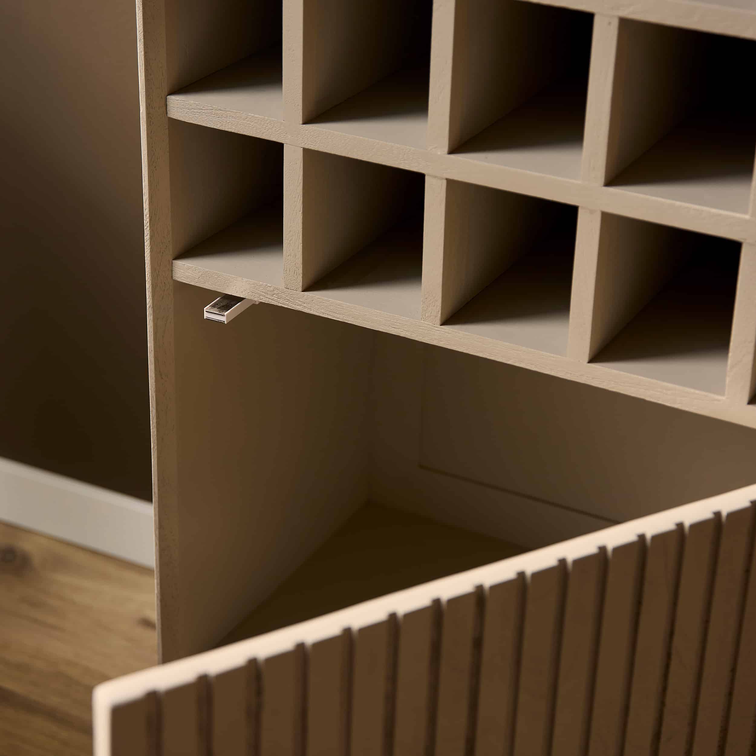 Wijnkast Madison Sand is gemaakt van licht gezandstraald mangohout en afgewerkt met een sand finish. Het metalen frame is afgewerkt met een bronzen finish. Dit model heeft 15 vakken voor wijnflessen en een deur dat voorzien is van een verticaal lattenpatroon. Achter de deur bevindt zich een extra opbergvak.