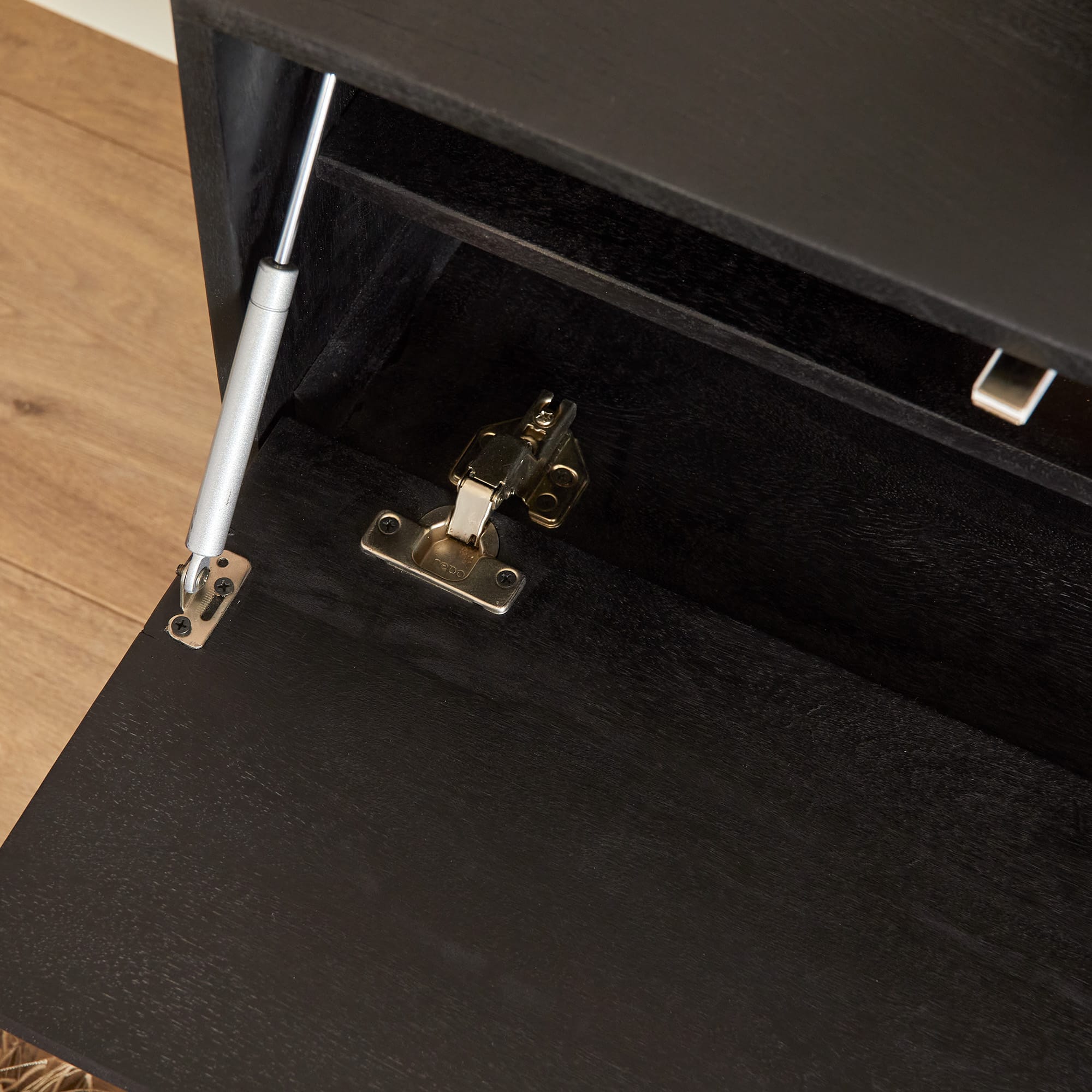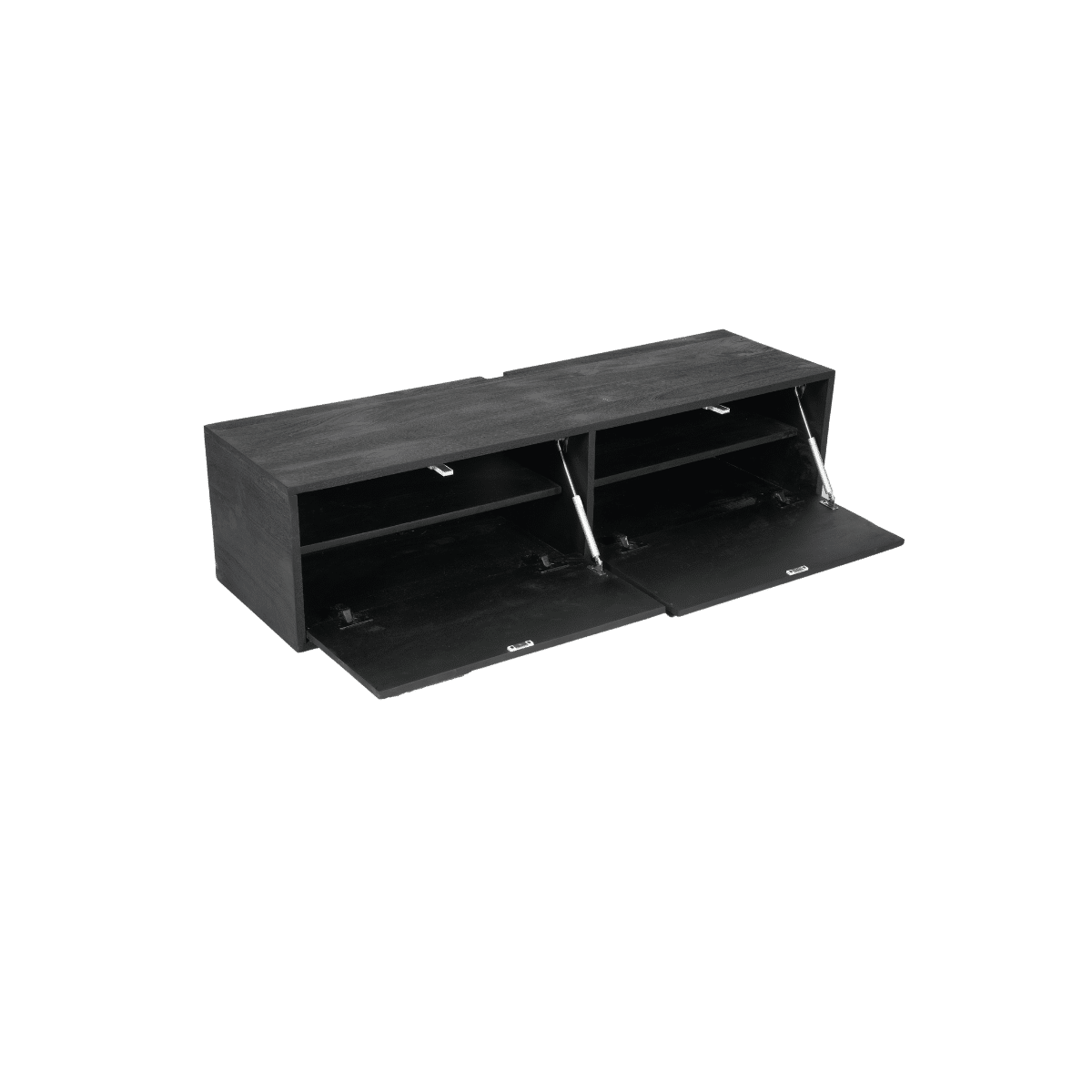Zwevend tv meubel Vision is gemaakt van massief mangohout. Het model kenmerkt zich door zijn strakke uitstraling en is greeploze deurtjes. De deurtjes zijn voorzien van een push to open systeem. Het meubel is afgewerkt met een zwarte lak.