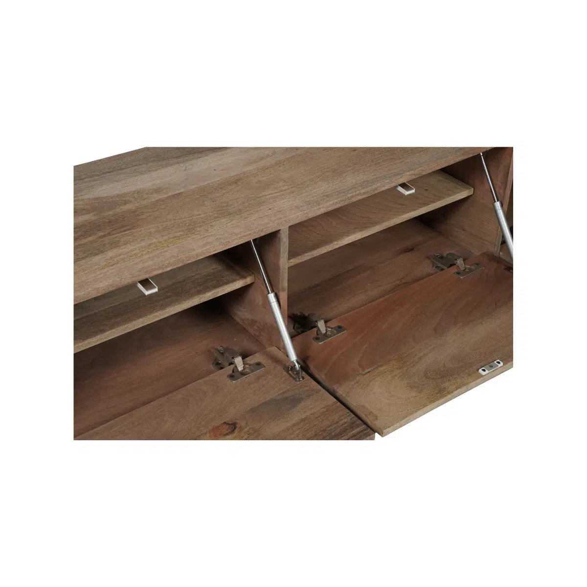 Zwevend tv meubel Vision is gemaakt van massief mangohout. Het model kenmerkt zich door zijn strakke uitstraling en is greeploze deurtjes. De deurtjes zijn voorzien van een push to open systeem. Het meubel is afgewerkt met een lak.